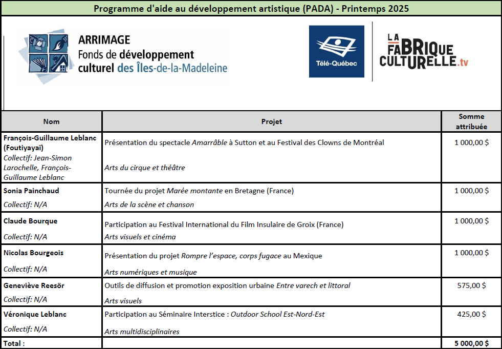 Arrimage, Corporation culturelle des Îles a annoncé la semaine dernière que cinq artistes et un collectif se sépareront une somme totalisant 5000 dollars.