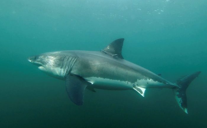 On peut apercevoir les balises apposées à la base de la nageoire dorsale du requin (photo: Groupes de recherche du MPO sur les phoques et les requins du Québec et des Maritimes)