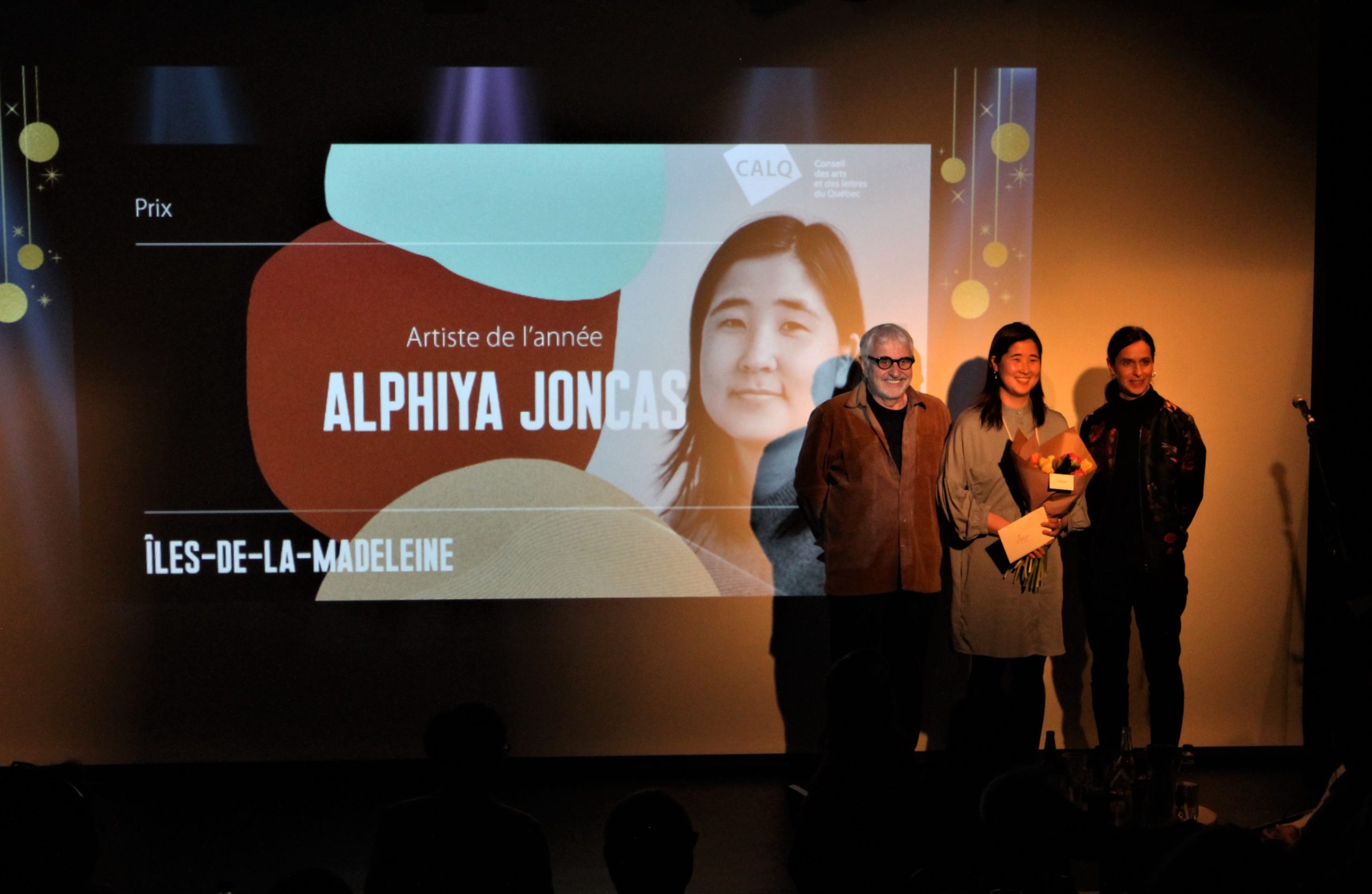 Alphiya Joncas entourée de Denis Pellerin (Arrimage) et Véronique Fontaine du CALQ (photo: CFIM)