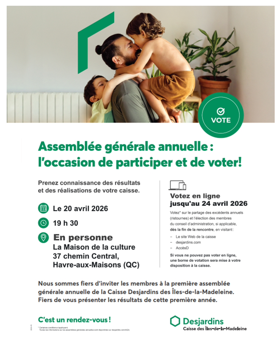 L’Assemblée générale annuelle du club 50 ans et plus de l’ile du Havre-Aubert aura lieu le dimanche 26 avril à 13:30 au Centre Multifonctionnel de l’Ile du Havre-Aubert. Plusieurs postes sont à combler.