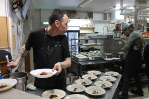 Ils seront cinq chefs aux fourneaux le lendemain. À la tête de la brigade, Inunnguaq Hegelund, venu du Groenland. C’est sa seconde visite aux Îles.