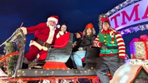 La journaliste Laurence Dami-Houle a passé le défilé aux côtés du Père Noël et de ses lutins (photo: CFIM)