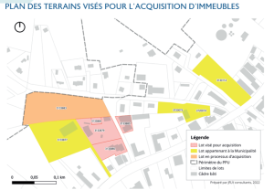 Dans la même optique, la Municipalité veut acquérir certains terrains (rose) tandis que d’autres lots sont en voie d’acquisition (orange) (carte: Plan particulier d’urbanisme)