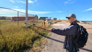 Councilor Georges Painchaud, who represents the citizens of Cap-aux-Meules and Île d’Entrée, indicating the planned new location of the municipal toilets, at the extremity of the current transshipment center (photo: CFIM)