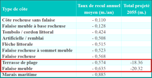 Le taux de recul moyen annuel par type de côtes (source: MunÎles)