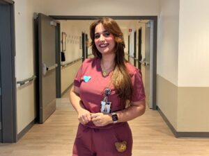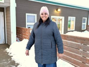 Ikram Kaddouri arbore fièrement un cœur bleu en feutrine, faisant écho à la campagne initiée par l’Union des municipalités du Québec (UMQ) qui vise à mobiliser la population pour «dénoncer les effets des changements récents aux politiques migratoires sur les personnes immigrantes déjà établies au Québec» (photo: CFIM)