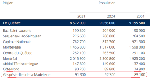 Selon les projections de l’ISQ, la population de la Gaspésie et des Îles tomberait à 85 100 résidents en 2051 (capture d’écran ISQ / montage CFIM)