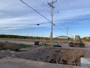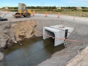 C’est que la prochaine opération pour le remplacement du ponceau nécessite l’aide d’une grue et que la zone de travaux est située à proximité d’une ligne de transport d’électricité. Hydro-Québec doit couper le courant afin que les travailleurs interviennent en toute sécurité.
