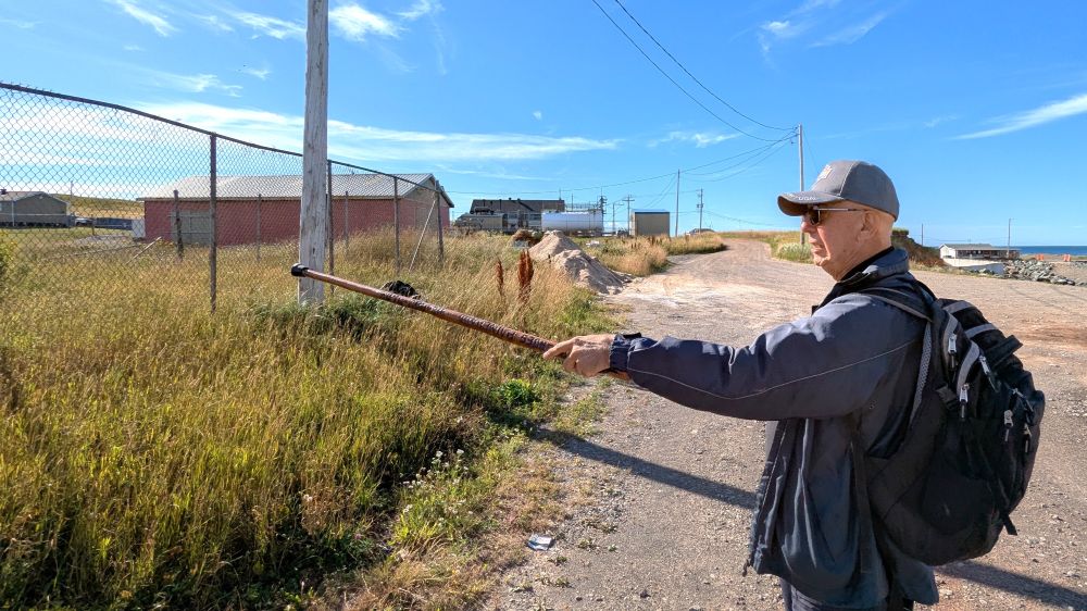 Le conseiller municipal Georges Painchaud, qui représente les citoyens de Cap-aux-Meules et de l’Île d’Entrée, indiquant le nouvel emplacement prévu des toilettes municipales, à l’extrémité du centre de transbordement actuel (photo: CFIM)