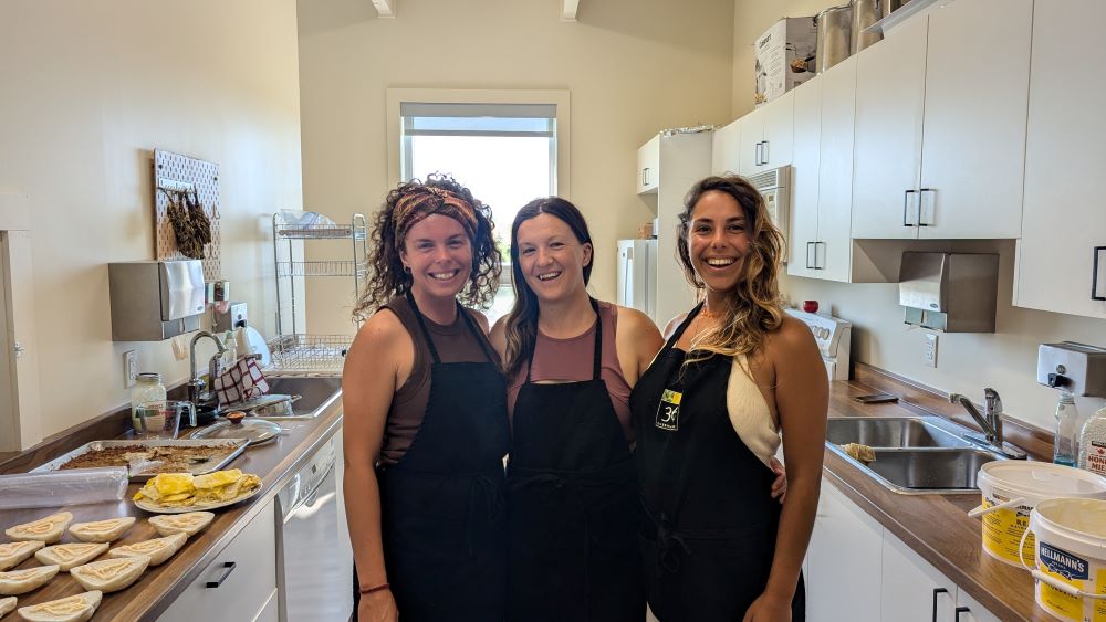 Nebesna Tremblay (au centre) a lancé son service de traiteur Esprit Nature à l’Île d’Entrée en 2023. À cette fin, elle utilise la cuisine de l’ancienne école, reconvertie en musée par le CAMI. Elle est accompagnée sur la photo de ses deux employées, Claudie et Virginie-Rose (photo: CFIM)
