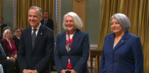 La ministre Joanne Thompson (au centre), flanquée du premier ministre Mark Carney et de la gouverneure générale Mary Simon (capture d’écran: CPAC)