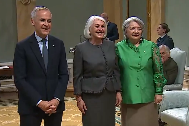 La ministre Joanne Thompson flanquée du premier ministre Carney et de la gouverneure générale du Canada, Mary Simon (capture d’écran CPAC)