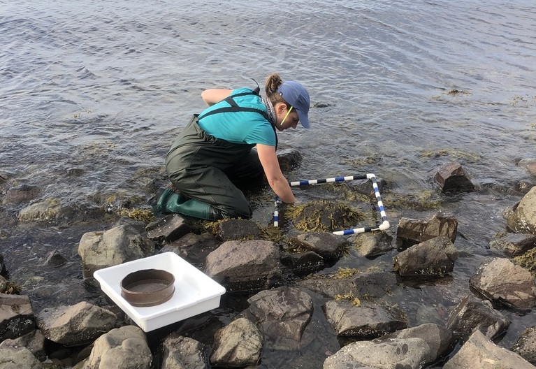 La professionnelle de recherche Sonia Pagé en train de prendre des échantillons d’algues et d’invertébrés benthiques (photo: gracieuseté Gabrièle Deslongchamps)