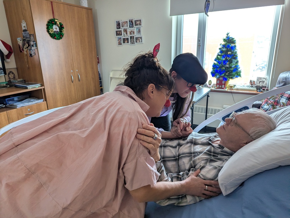 Janick Chevarie et Josiane Lefrançois entourent un résident, très émotif de les voir (photo: CFIM)