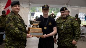 Le ranger junior Malik Palluel-Cormier (au centre), tenant le trophée Strathcona, flanqué par le colonel Benoit Mainville (à gauche) et l’adjudant-chef Mike Egan (à droite) (photo: Rangers juniors canadiens)