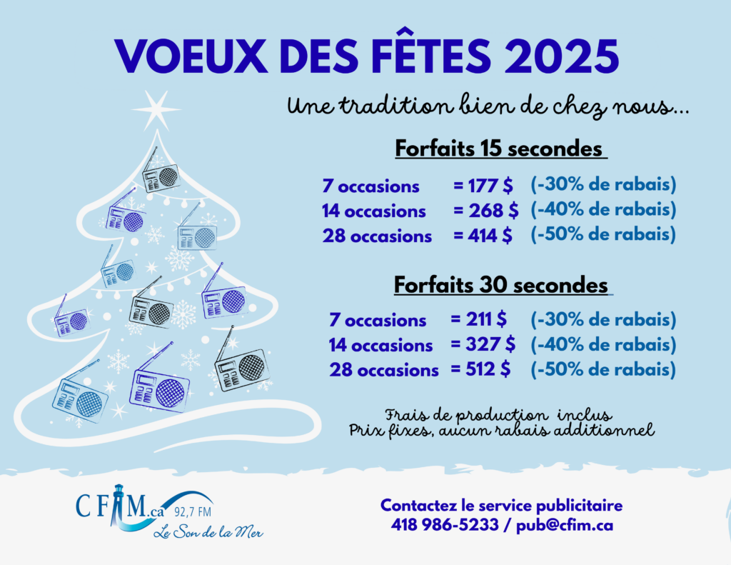 Comme chaque année, CFIM vous propose de transmettre vos vœux des Fêtes radiophoniques à vos clients, partenaires ou employés — une tradition bien de chez nous, toujours appréciée par la communauté.