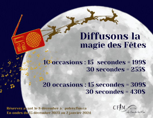 Comme chaque année, CFIM vous propose de transmettre vos vœux des Fêtes radiophoniques à vos clients, partenaires ou employés — une tradition bien de chez nous, toujours appréciée par la communauté.