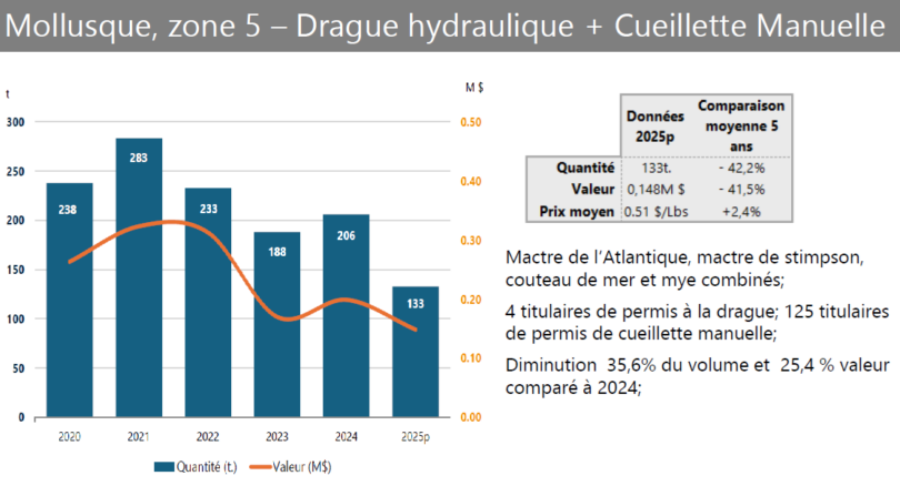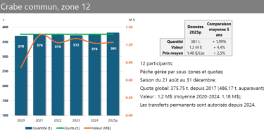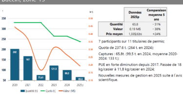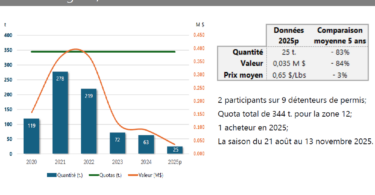 Pour ce qui est des autres espèces, les pétoncliers ont encore eu une excellente saison – une véritable histoire à succès, remarque M. Arseneau. Les pêcheurs de flétan s’en sont bien tirés, malgré des dépassements de quota importants. Des pêcheries d’appoint, comme le buccin ou le crabe araignée, elles, trainent de la patte.