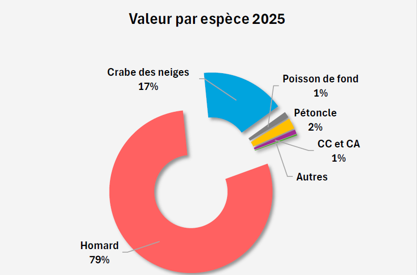 Le homard et le crabe des neiges continuent de trôner au sommet: mis ensemble, ils représentent 82% des volumes et 96% de la valeur totale. La flotte de homardiers a d’ailleurs connu sa meilleure année en termes de valeur au débarquement avec 119 millions.
