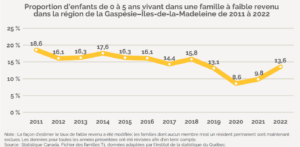 Le rapport note aussi qu’entre 2011 et 2022, le taux d’enfants madelinots et gaspésiens vivant dans une famille à faible revenu a baissé, mais demeure plus élevé que dans le reste du Québec. L’année 2020 n’est pas comptabilisée dans ces données.