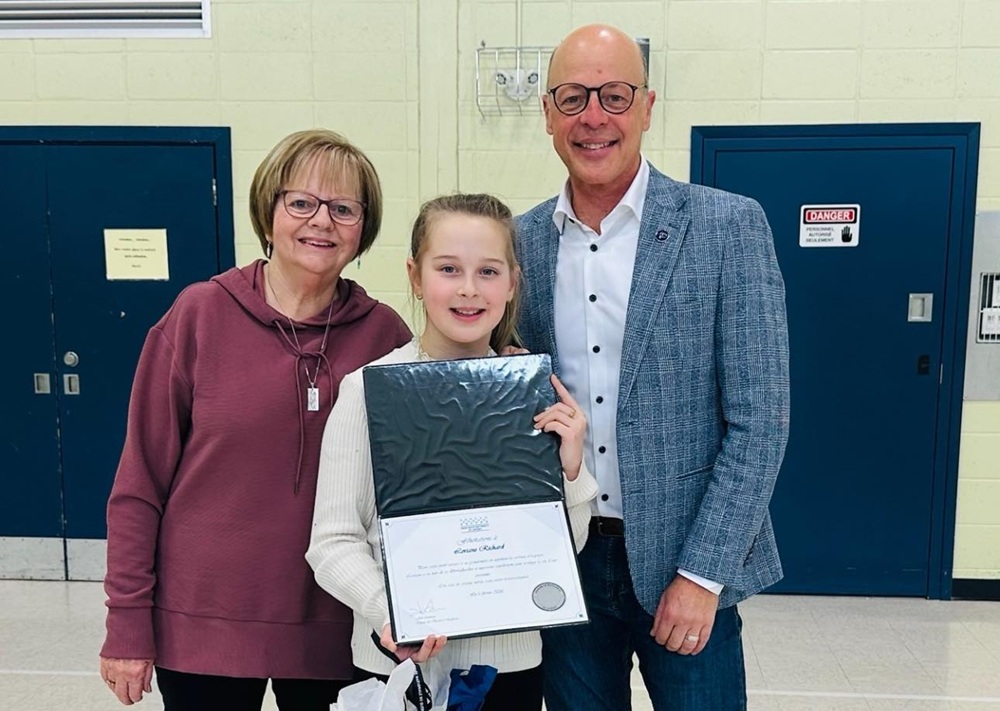 Le député Arseneau a remis un certificat honorifique à Loriane lors d’une cérémonie organisée en présence de sa famille, des élèves et du personnel scolaire, le 6 février.