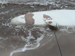 Afin d’éviter qu’elle ne dérive vers le large, la carcasse a été sécurisée avec une corde. Sa présence a été signalée à Urgences Mammifères Marins.