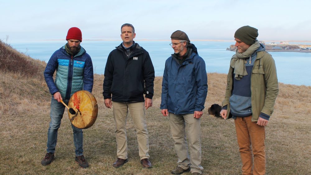 Bruno Savary, Martin Claveau, Luc Longuépée et François Miousse, du groupe Les Gaillards, ont interprété une chanson à la fin du défilé (photo: CFIM)