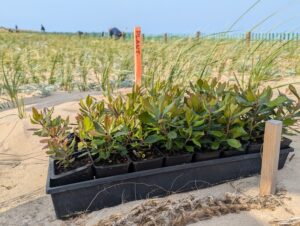 Les plants ont grandi à l’extérieur des Îles. Du paillis de bois de cage à homard (une initiative du CERMIM et du RPPCI) a été disposé autour de chaque spécimen introduit sur la dune (photo: CFIM)