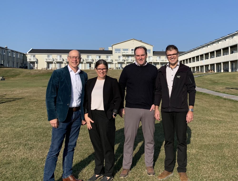 Le ministre Girard (à droite) souhaitait souligner la stratégie de repreneuriat des nouveaux propriétaires du Château Madelinot, Ariane Bérubé et Charles Couturier (au centre), en compagnie du député des Îles Joël Arseneau (photo CFIM)