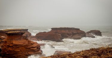 grappe de grès prisonnière du brouillard… et des vagues qui tentent de percer le rempart.