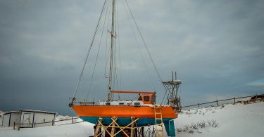 solidement remisé pour l’hiver… mais pas trop loin du débarcadère.